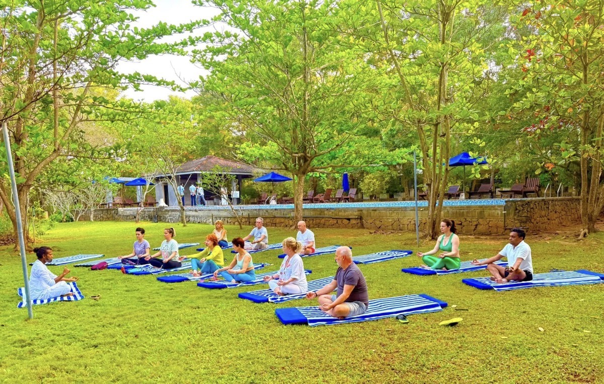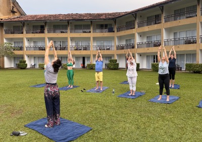 Reggeli jóga pálmafák árnyékában, frissítő légzőgyakorlatokkal.